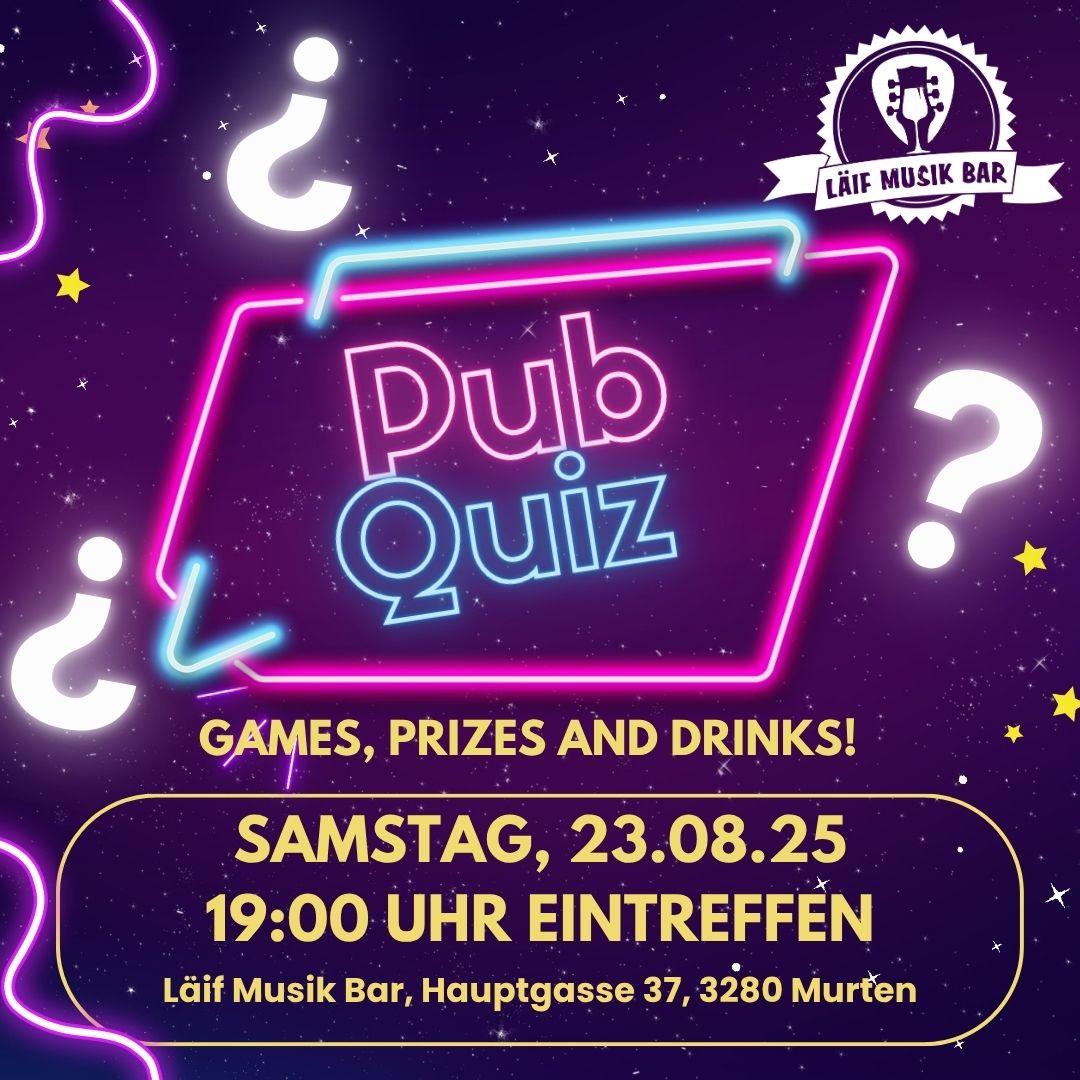 Die Läif Musik Bar in Murten lädt zu ihrem beliebten Pub Quiz ein. Ihr werdet in fünf verschiedenen Kategorien auf die Probe gestellt. Kategorien können sein: