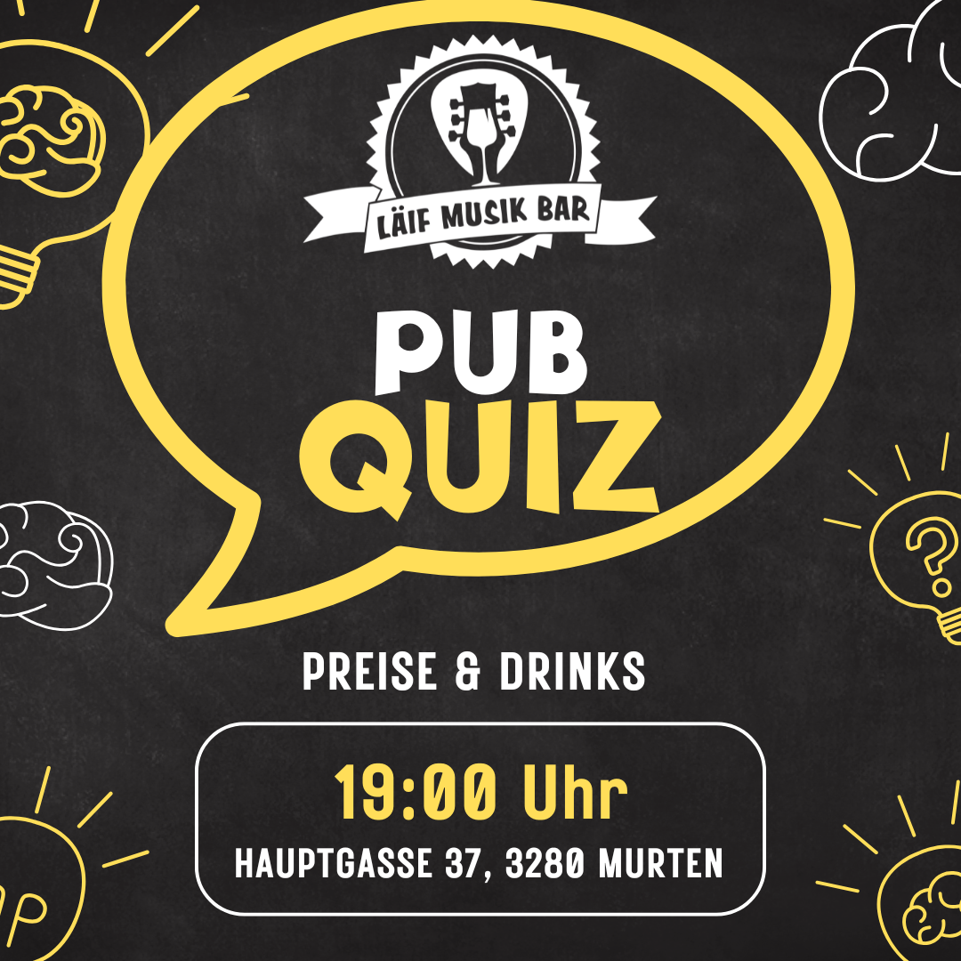 Die Läif Musik Bar in Murten lädt zu ihrem beliebten Pub Quiz ein. Ihr werdet in fünf verschiedenen Kategorien auf die Probe gestellt. Kategorien können sein: Allgemeinwissen Sport Geografie Geschichte Musik und viele mehr Gruppen von zwei bis vier Personen sind herzlich willkommen. Für die Sieger...